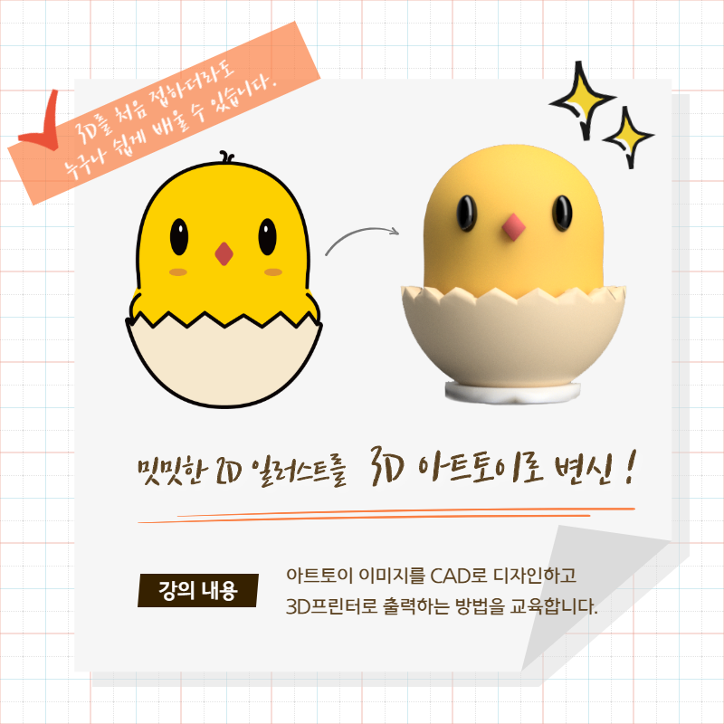 3D 프린터로 실제 출력까지 할 수 있는 방법을 알아갈 수 있도록 쉽고 재미있게 교육해드립니다.