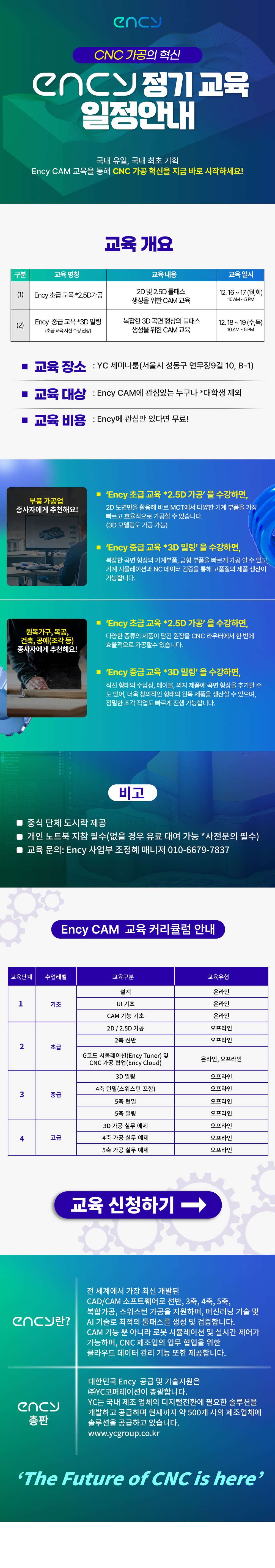 전 세계에서 가장 최근 개발된 CAD/CAM 솔루션 Ency CAM 오프라인 교육이 진행됩니다.