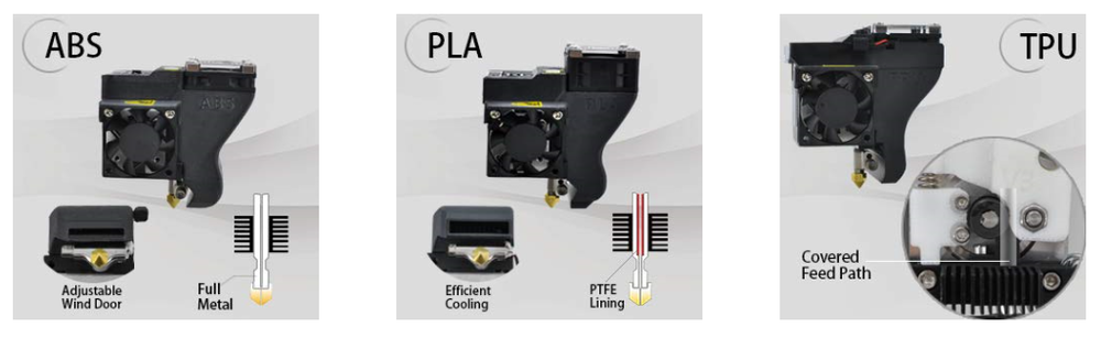 PLA, TPU(폴리우레탄) 등 낮은 온도 전용 익스트루더를 각각 사용할 수 있어 높은 퀄리티의 작품을 출력할 수 있습니다.