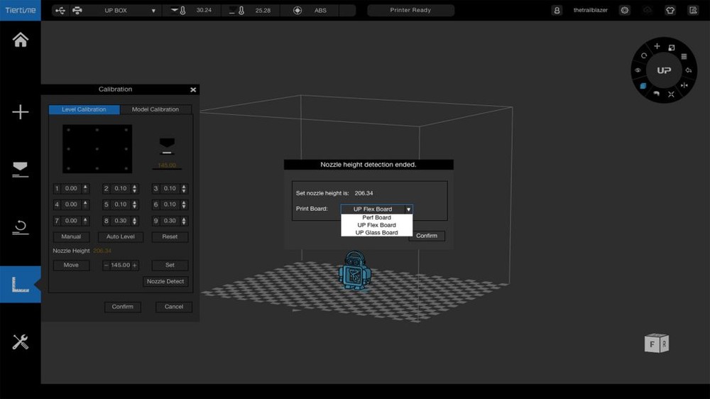 이해하기 쉬운 아이콘 들을 클릭만해주면 모델 편집, 서포트 생성 및 G코드 생성 작업들이 자동으로 진행되는 UP 3D 프린터 전용 슬라이싱 프로그램입니다. 다양한 CAD 포맷을 불러올 수 있고, 출력물의 퀄리티를 결정할 노즐, 보드, 프린터 등의 온도와 출력 속도와 같은 여러 세팅 값들을 최적화 해서 자동으로 설정할 수 있습니다.